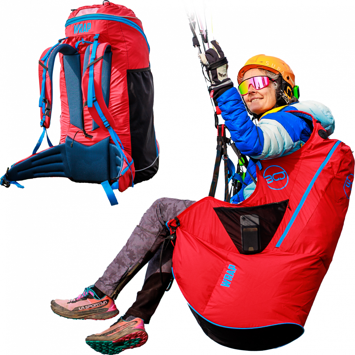 The WRAP is available in four sizes, with a rucksack volume of 80-102 litres, depending on the size. The harness is weight-shift friendly without being ‘wobbly’. In both harness and rucksack formats there are plenty of accessible pockets, and a drinks-pouch system with tube routings. You can fit a lightweight wing such as the Echo 2, Breeze or Lynx 2 inside along with your helmet, instruments and spare clothing, and there is a fold-away external helmet holder and elastic cord to carry additional clothing if you need them.